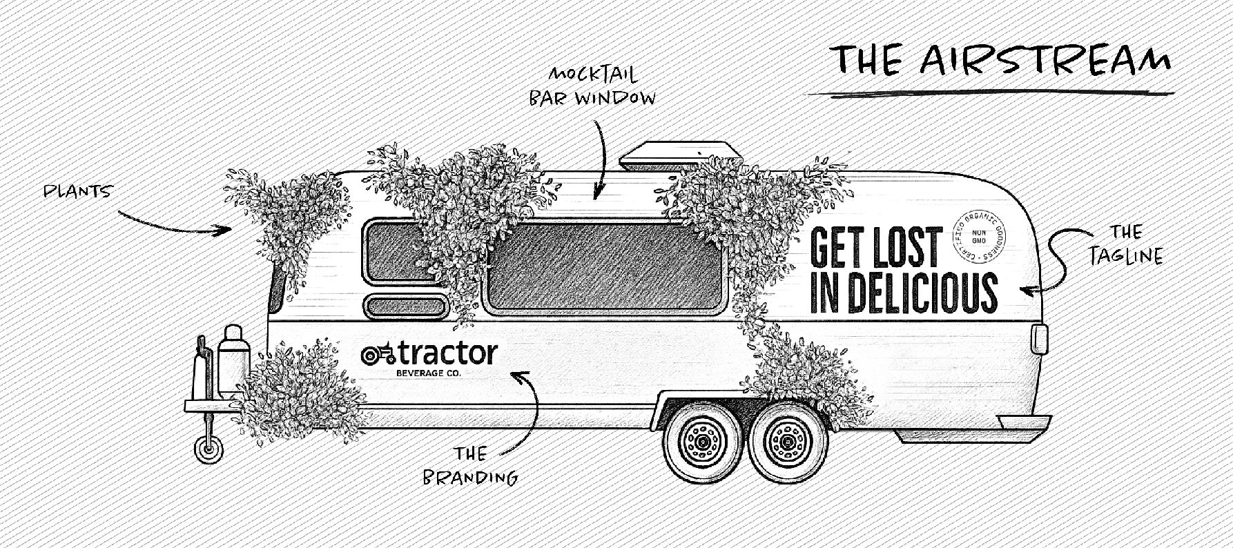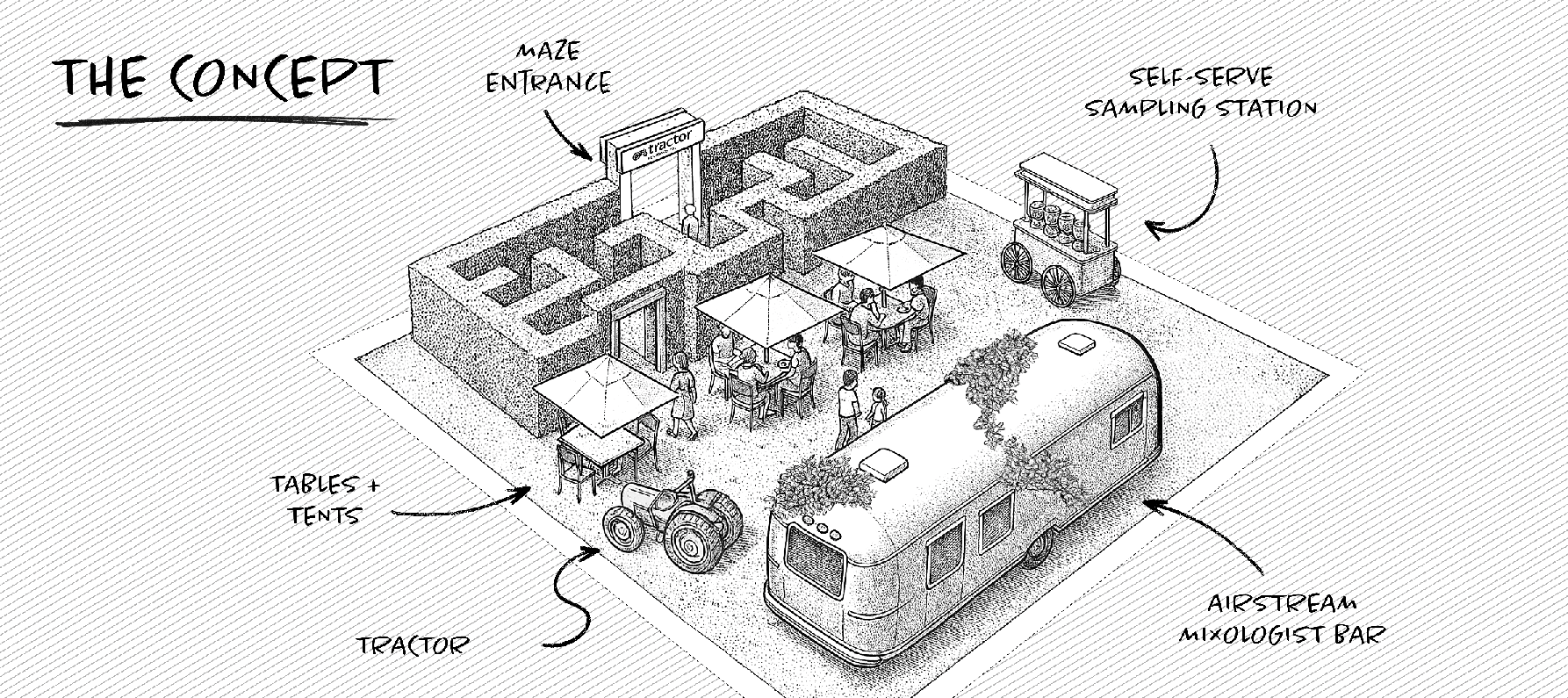 “Get Lost in Delicious.” We created a traveling brand world that invited people to wander through flavor, discovery and delight. Inspired by Alice in Wonderland and Tractor’s own playful ingredient palette, each activation transformed public spaces into immersive sensory escapes. A fruit hedge maze invited guests to wander through giant flavor sculptures and discovery moments before reaching their reward: a cold, organic drink served over ice. An Airstream mixology bar, draped in greenery and fruit, served the crafted mocktails and Tractor’s signature sodas.