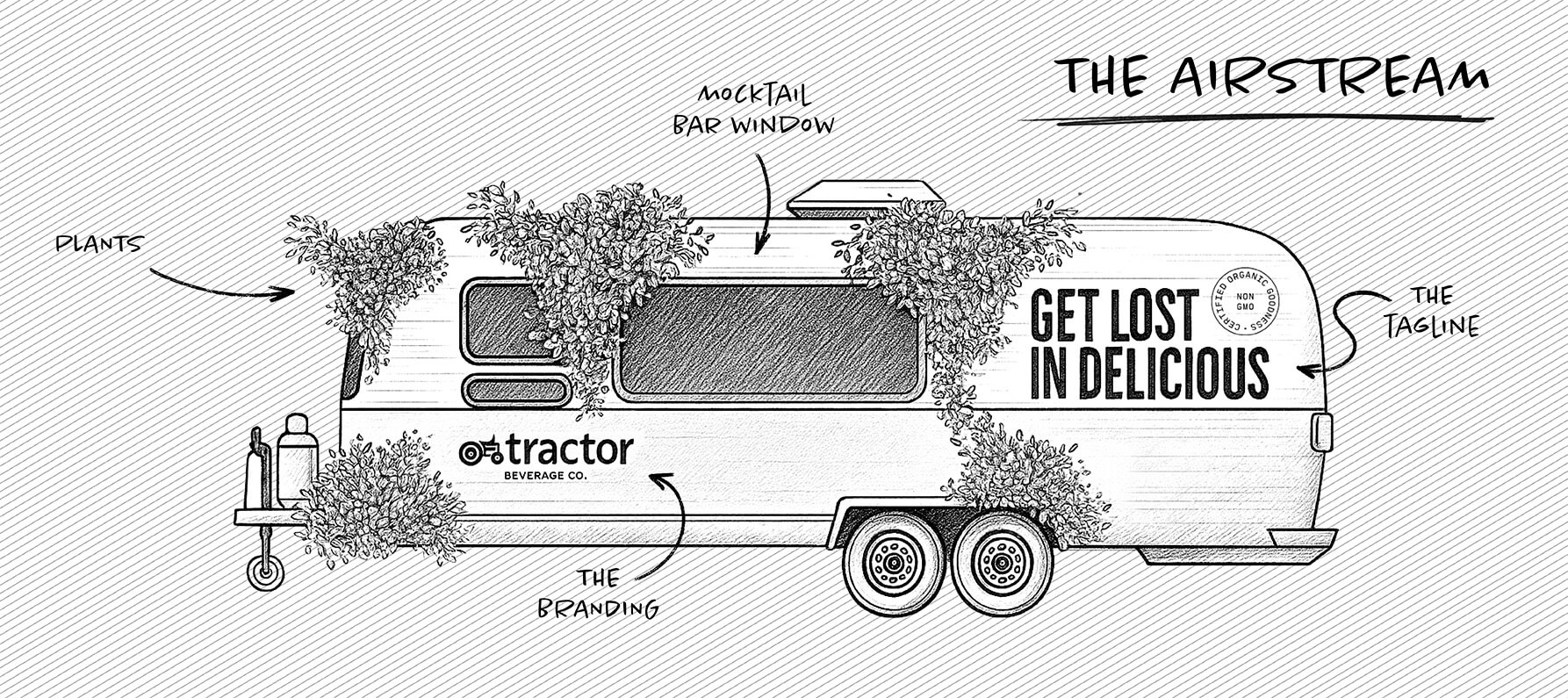 “Get Lost in Delicious.” We created a traveling brand world that invited people to wander through flavor, discovery and delight. Inspired by Alice in Wonderland and Tractor’s own playful ingredient palette, each activation transformed public spaces into immersive sensory escapes. A fruit hedge maze invited guests to wander through giant flavor sculptures and discovery moments before reaching their reward: a cold, organic drink served over ice. An Airstream mixology bar, draped in greenery and fruit, served the crafted mocktails and Tractor’s signature sodas.